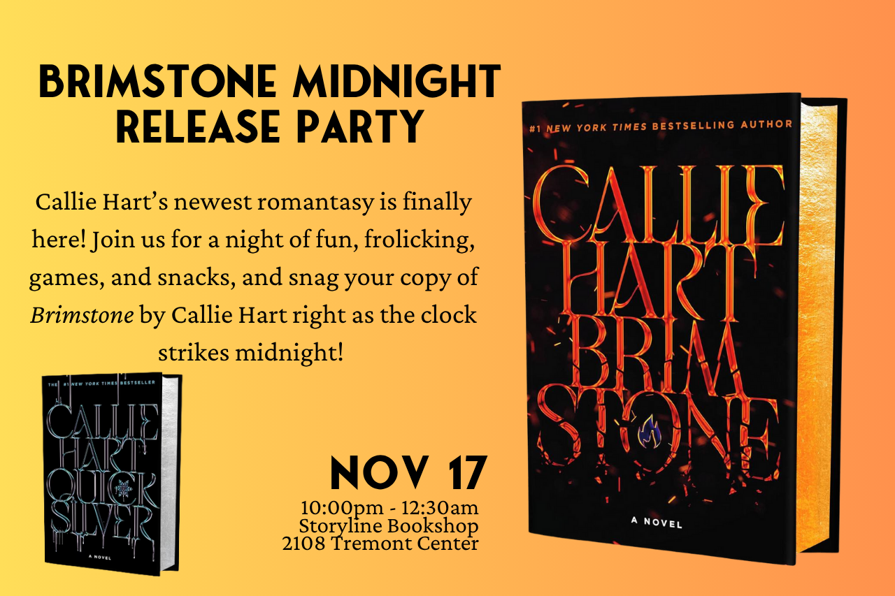 Callie Hartâs newest romantasy is finally here! Join us for a night of fun, frolicking, games, and snacks, and snag your copy of Brimstone by Callie Hart right as the clock strikes midnight!