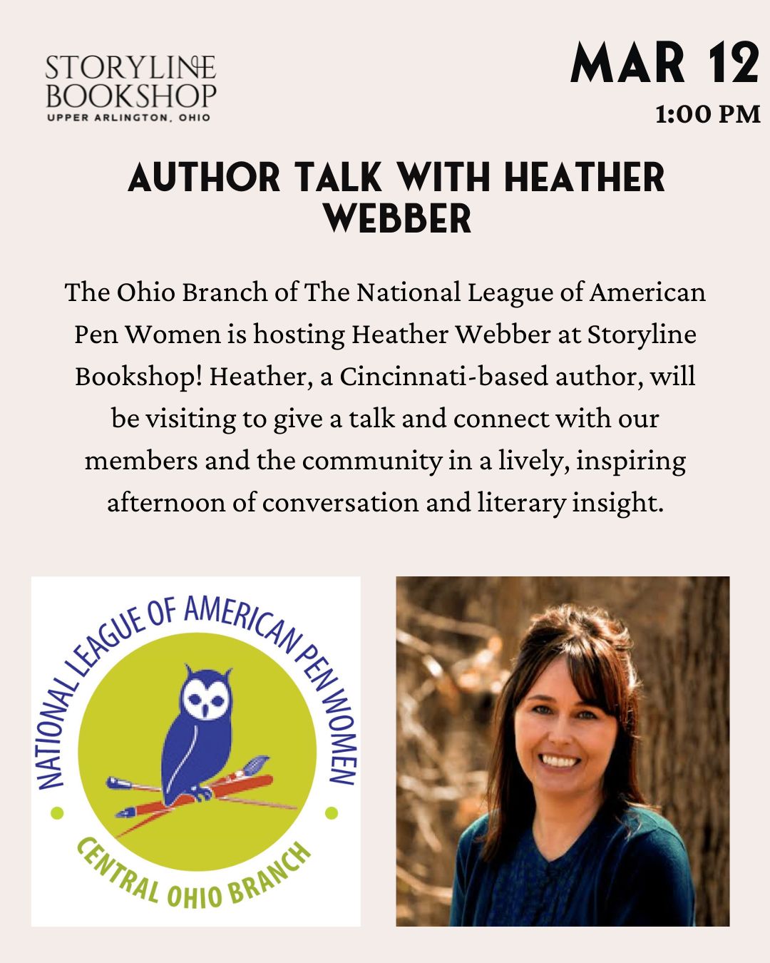 The Ohio Branch of The National League of American Pen Women is hosting Heather Webber at Storyline Bookshop! Heather, a Cincinnati-based author, will be visiting to give a talk and connect with our members and the community in a lively, inspiring afternoon of conversation and literary insight.